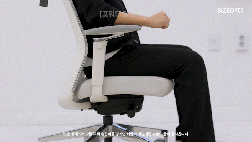 설명 : 앉은 상태에서 오른쪽 좌판 아래의 뒤쪽 레버를 아래방향으로 회전하여 앞으로 이동시켜 주시면 좌판 뒤쪽이 올라갑니다.
