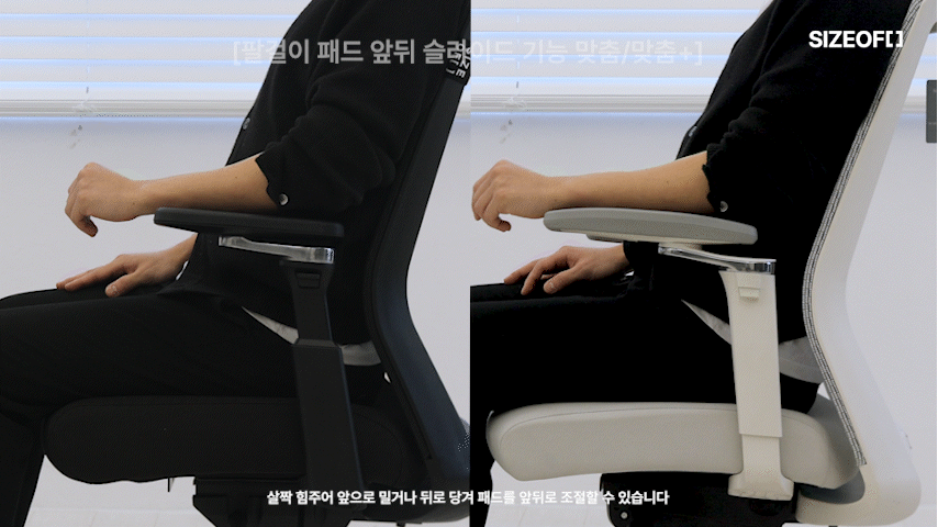 다시 넣을 때에는 레버를 올린 뒤 반대 손으로 등받이를 잡고 엉덩이를 뒤로 밀어주시면 좌판이 다시 줄어듭니다.
