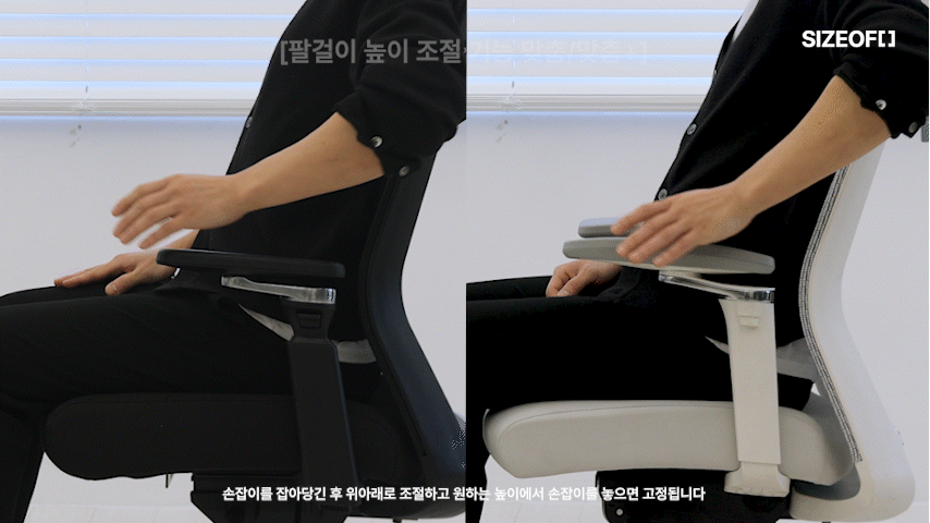 설명 : 팔걸이의 높이를 조절하고 싶으실 경우, 팔걸이 바깥쪽 레버를 위로 올린 상태에서 팔걸이 높이를 조절해주시면 됩니다. 팔 받침대는 2개의 관절에따라 회전하여 원하는 위치에 놓고 사용해주시면 됩니다.